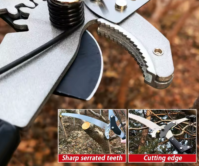 - Une fois la branche coupée, le système crénelé du sécateur permet de récupérer et maintenir la branche lors de la descente. vous pourrez donc assister la chute de la branche facilement grâce à un maintien solide.