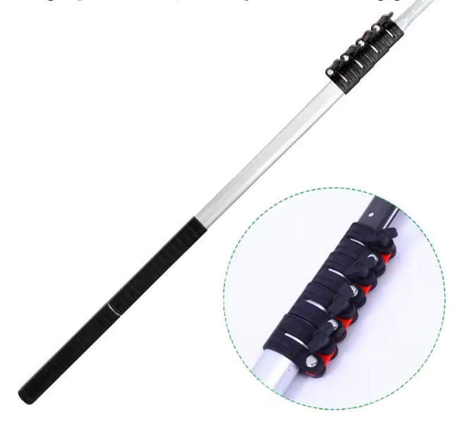 Nous avons ici un manche en aluminium pour une utilisation professionnelle. Simple, robuste, léger et très facile à développer. Vous allez pouvoir développer le manche en 5 sections grâce à des vis papillons. Le scellement s’effectue facilement et bloque réellement le manche à la hauteur voulue. En fonction du modèle choisit vous pourrez développer le manche de 3 à 6 mètres.
